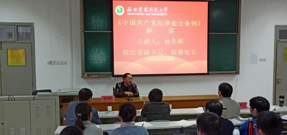 为落实全面从严治党要求,近日,成教学院邀请校纪委副书记、监察处处长孙升辉来院作《中国共产党纪律处分条例》专题辅导报告。学院领导、全体党员、教职工、新疆林业科研骨干人才研修班和榆林市米脂县苹果产业发展骨干人才培训班全体学员近百人聆听了报告。报告会由院党委书记宋西德主持。